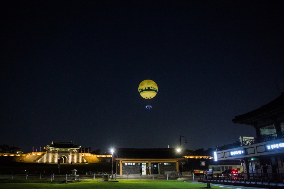 フライング水原(スウォン)は地上係留型ヘリウム気球で、最高150メートル上空から水原華城全体を眺望できるユニークなアトラクションです。最大30人まで搭乗可能、搭乗時間は上昇・停止観覧・下降を含めて約10分で、季節ごとに魅力ある水原華城を空から観賞することができます。欧州の専門検査院(JAR21)規定通過、フランス保健局安全公認完了など安全性が検証されており、また乗客の安全のために訓練されたパイロットが同乗します。
