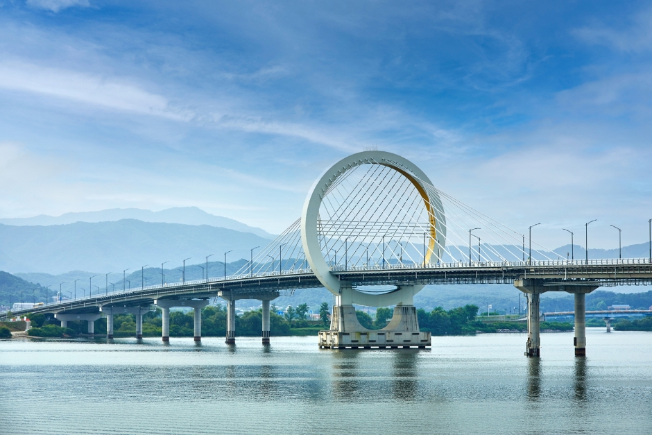 衣岩(ウィアム)湖に浮かぶ島、中島(チュンド)にあるレゴランドテーマパークと春川(チュンチョン)市内を結ぶ大橋。2019年に今年の土木構造賞で金賞を受賞した橋で、橋の上のケーブルを繋いだ円形の塔が印象的です。多彩な照明でライトアップされる夜景スポットで、爽快なドライブが楽しめるスポットとしても人気です。毎晩3回(20:00、21:00、22:00)行われる華麗な噴水ショーも見もので、春川の多彩な姿を12種類のイメージで表現しており、稼働時間は約40分間です。ドラマ『二十五、二十一』でキム・テリとナム・ジュヒョクが虹を眺めたシーンが撮影されたロケ地でもあります。