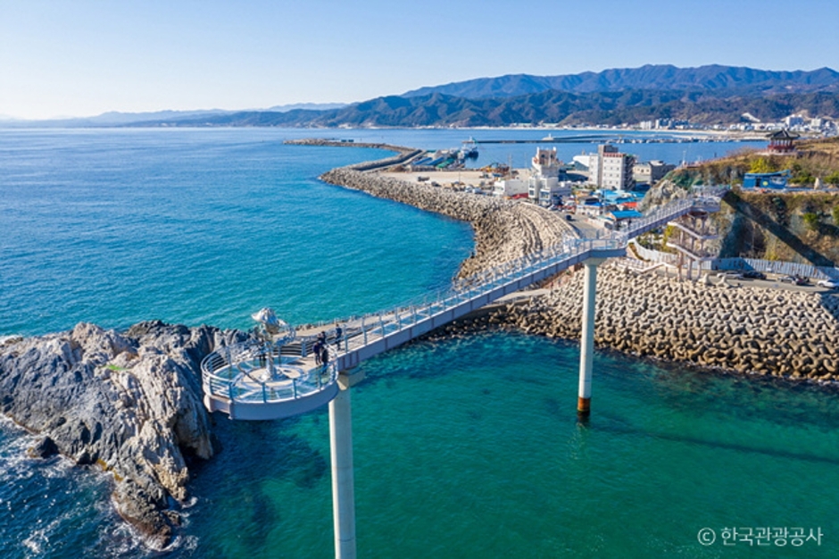 登起山(トゥンギサン)スカイウォークは、蔚珍厚浦港(ウルチン・フポハン)の裏側にある高さ20メートル・長さ135メートルの橋です。そのうち57メートルは、強化ガラスの床の区間となっていて、足元から青い海を見下ろすことができ、海の上を歩いているような錯覚を覚えます。橋の途中には、一つの願いは必ず叶えてくれるといわれる厚浦カッパウィ(笠岩)があります。橋を渡ると、厚浦灯台と世界的に有名な灯台の造形物が見られる厚浦・登起山(フポ・トゥンギサン)公園につながります。