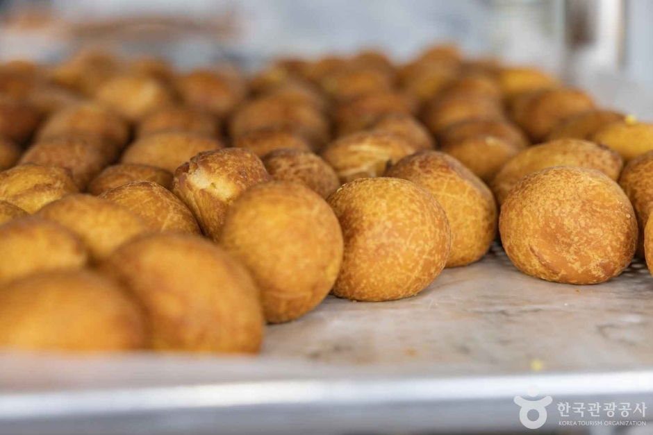 統営(トンヨン)港近くの中央市場に行くと統営クルパンの店が並んでいます。統営クルパンは統営の暖かい気候でも腐らずに長く食べられるように考案されたもので、主に船乗りたちが好んで食べたおやつです。小麦粉生地の中にあんこをいっぱい詰めて油で揚げて、表面に蜂蜜をからめたもので、今では統営を代表するおやつとして知られる地域の名物です。統営クルパンの元祖はオミサクルパンで、1960年代にクルパンを売り始め現在まで営業を続けており、今ではひとつの名所となりました。クルパン屋が立ち並ぶこの通りは目の前に統営港と南海があり、美しい風景を誇ります。周辺観光地としてトンピラン村、統営洗兵館(国宝)、忠武キンパプ屋通りなどがありグルメや見どころが豊富です。