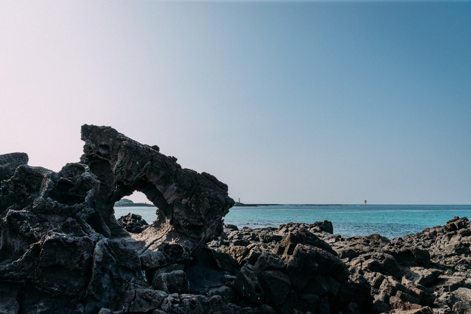 「チャンコム」は済州の方言で窓穴が開いた石という意味です。窓があるような奇岩で、立った岩に穴が開いており、旅行者の多くがこの穴を通して写真を撮ります。チャンコム岩から海側にタリョ島や防波堤が見えます。